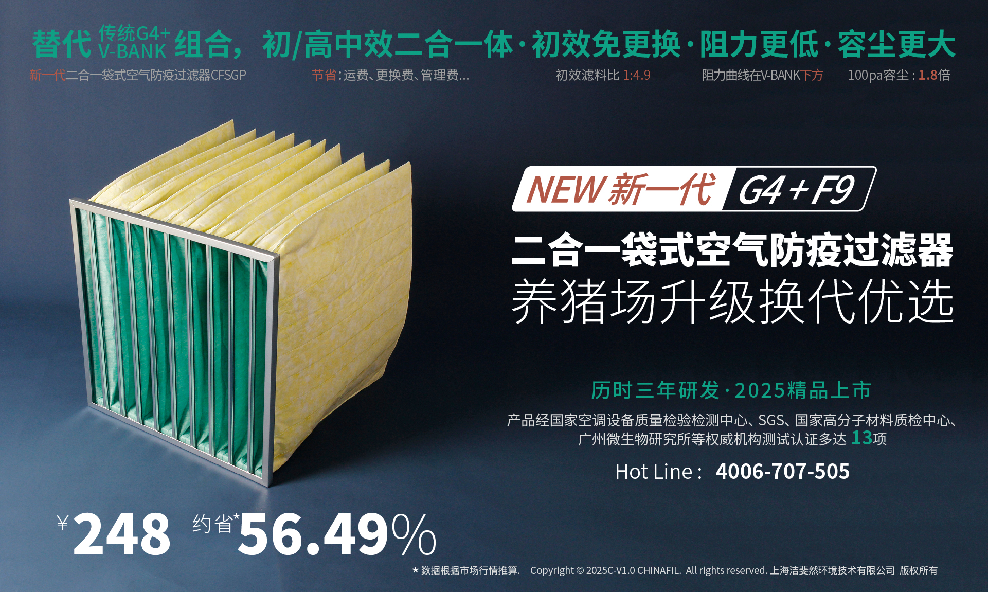 新一代二合一袋式猪场防疫过滤器CFSGP,是G4纸框板式+F9-V-bank过滤器模块的升级产品。它初效部分的滤料面积是传统G4纸框的4.9倍,容尘量更大,因此免除了畜牧防疫中繁杂的初效更换环节,仅此一项,减少的不仅仅是更换成本,也避免了更换时感染的风险。它的主过滤部分同样是F9效率,作为袋式过滤器,实现了批量规模化F9效率,这是难得的行业突破;