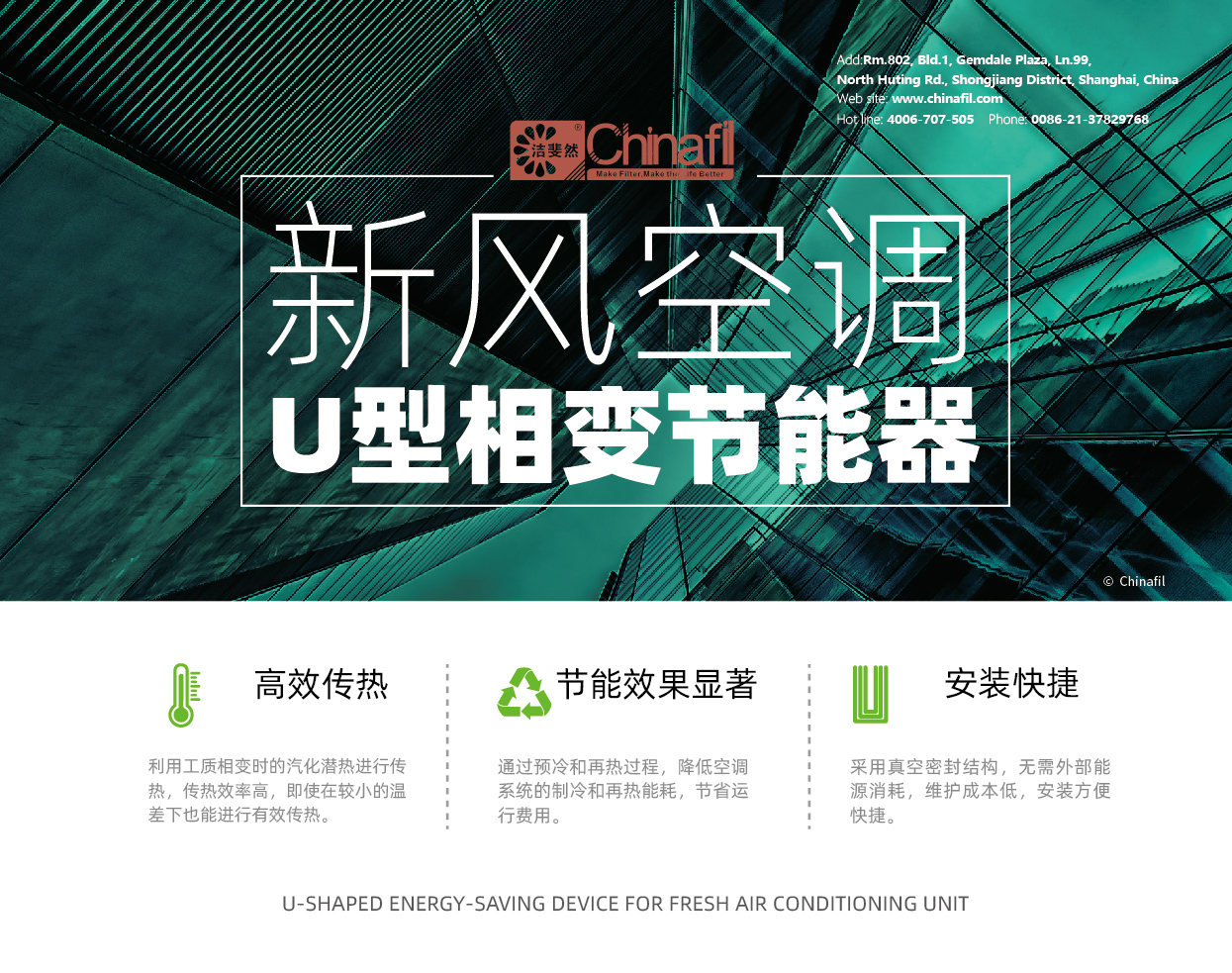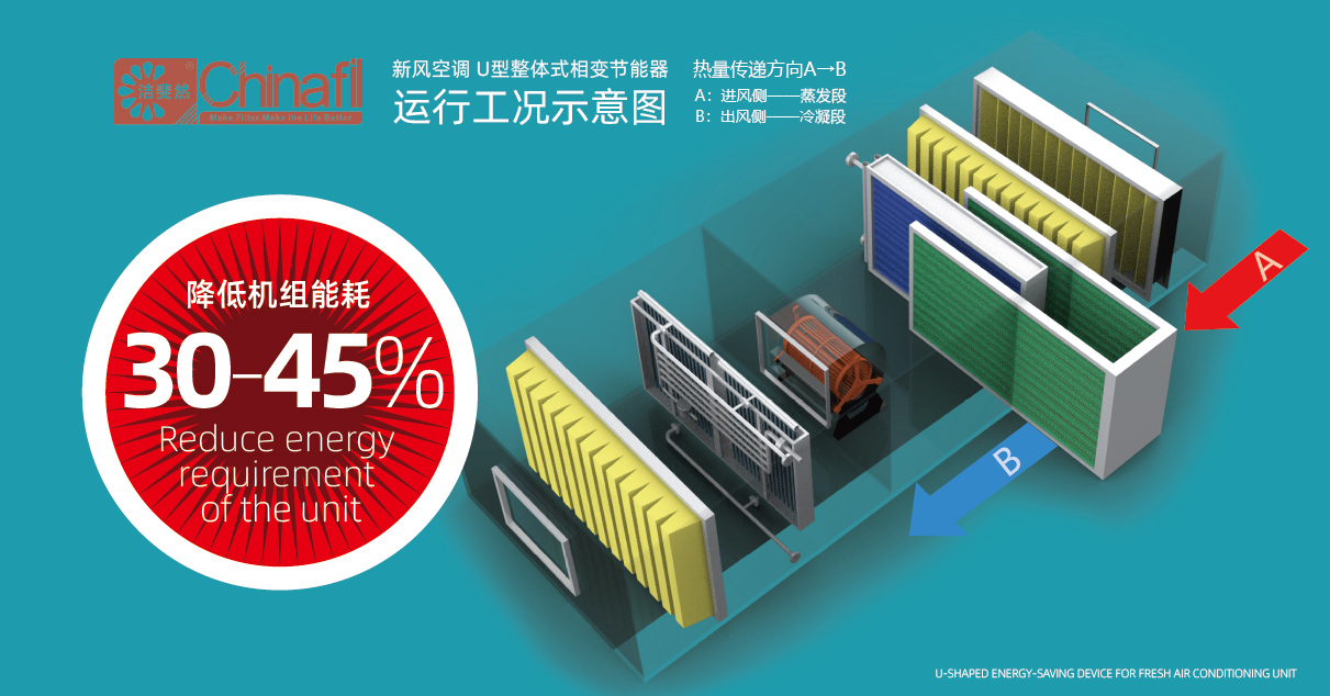 亚博亚新风空调专用U型节能器,它采用相变传热技术,通过两组换热器分别位于表冷前后,在热季实现高效的热量传递和节能效果。以10000CMH新风空调为例,热季节能效果:当新风空调为电再热形式时,一个完整热季约可省电50000元;当新风空调再热盘管热源为燃气的时候,一个完整热季约可省电40000元;当新风空调使用蒸汽再热时候,一个完整热季约可省电30000元。