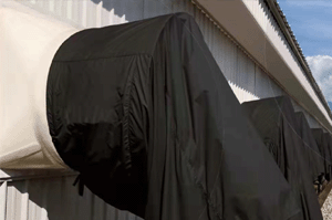常用的风机防回风布袋有牛津布、涤塔夫、尼丝纺三种材质,属性特点各有特点,可根据当地气候特点选用。